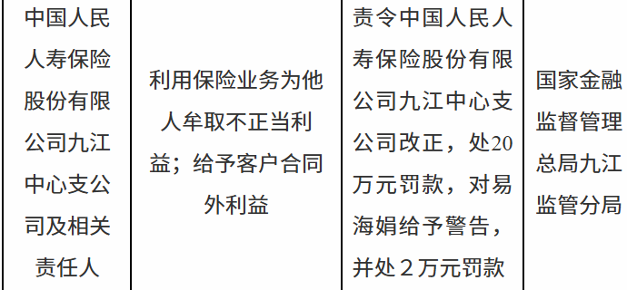 1月16日,国家金融监督管理总局九江监管分局行政处罚信息公开表显示,中国人民人寿保险股份有限公司九江中心支公司因利用保险业务为他人牟取不正当利益;给予客户合同外利益被处20万元罚款。责任人易某娟被警告并处2万元罚款。